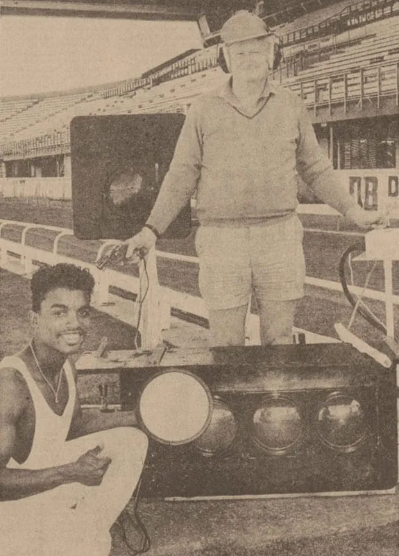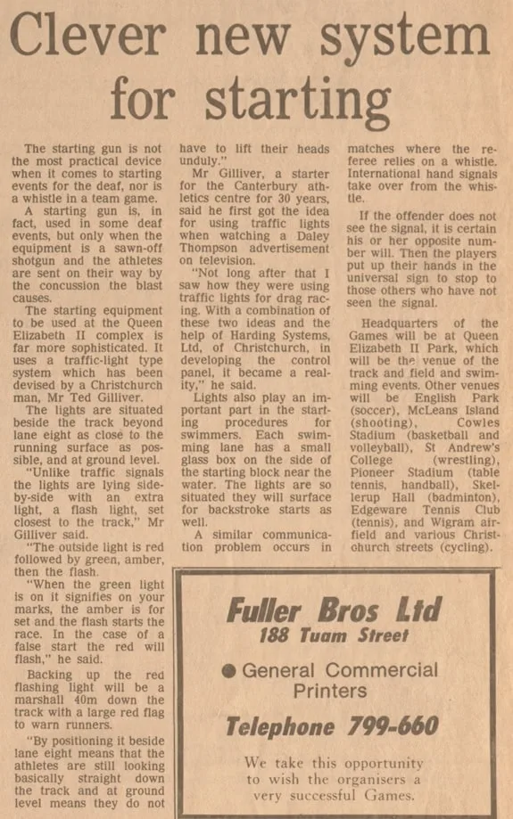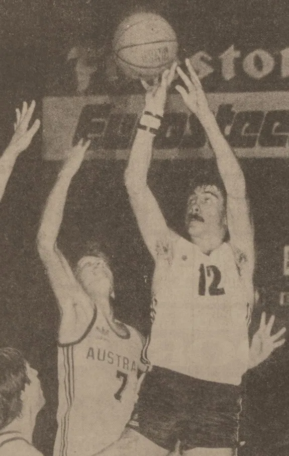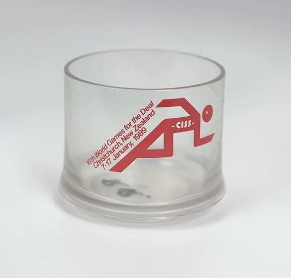 A white pennant with black text and imagery of a person playing basketball, and of another sprinting with the fern on both sides. The black text says “New Zealand Deaf Amateur Sports Assoc., NEW ZEALAND DEAF SPORTS TEAM, 16th WORLD GAMES for the DEAF, CHRISTCHURCH NEW ZEALAND, JANUARY 1989.